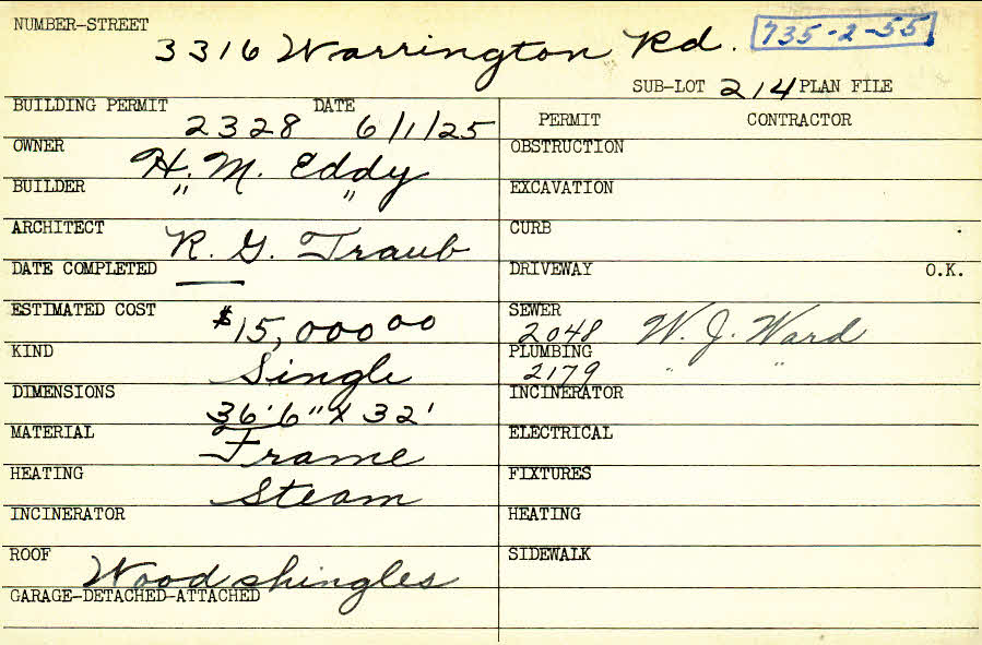3316 Warrington Road Shaker Heights, OH 44120 PARCEL ID: 735-02-055 Building Permit Date: 06-01-1925 Plan File Number: 0 Neighborhood: Onaway Owner: Eddy, H. M. Builder: Eddy, H. M. Architect: Traub, R. G. Estimated Cost: 15000 Kind: Single, Single Residence or Dwelling Material: Frame Heating: Steam Roof: Wood Shingle Card Available: yes |