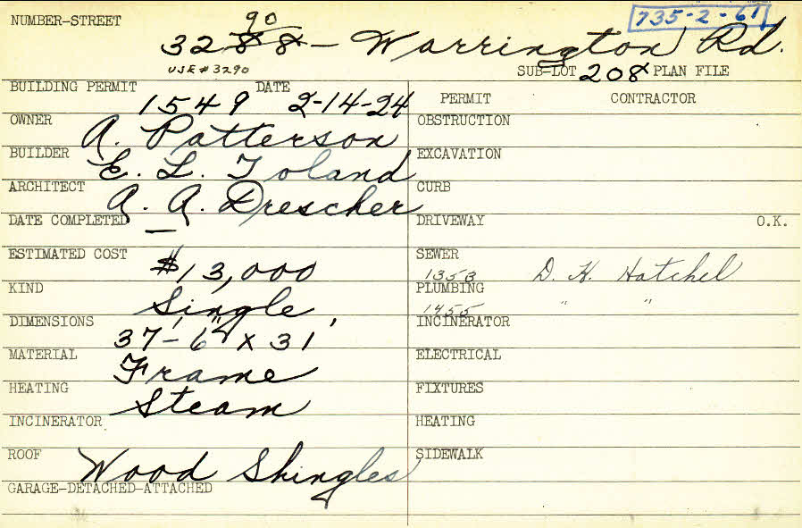 3290 Warrington Road Shaker Heights, OH 44120 PARCEL ID: 735-02-061 Building Permit Date: 02-14-1924 Plan File Number: 0 Neighborhood: Onaway Owner: Patterson, A. Builder: Toland, E. L. Architect: Drescher, A. A. Estimated Cost: 13000 Kind: Single, Single Residence or Dwelling Material: Frame Heating: Steam Roof: Wood Shingle Card Available: yes |