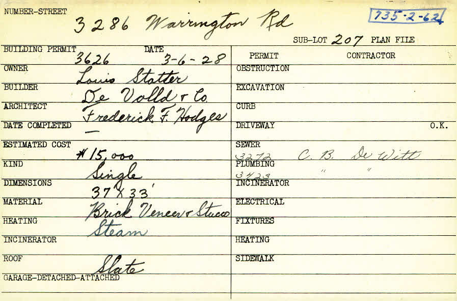 3286 Warrington Road Shaker Heights, OH 44120 PARCEL ID: 735-02-062 Building Permit Date: 03-06-1928 Plan File Number: 0 Neighborhood: Onaway Owner: Statter, Louis Builder: DeVolld and Company Architect: Hodges, Frederick F. Estimated Cost: 15000 Kind: Single, Single Residence or Dwelling Material: Brick Veneer and Stucco Heating: Steam Roof: Slate |