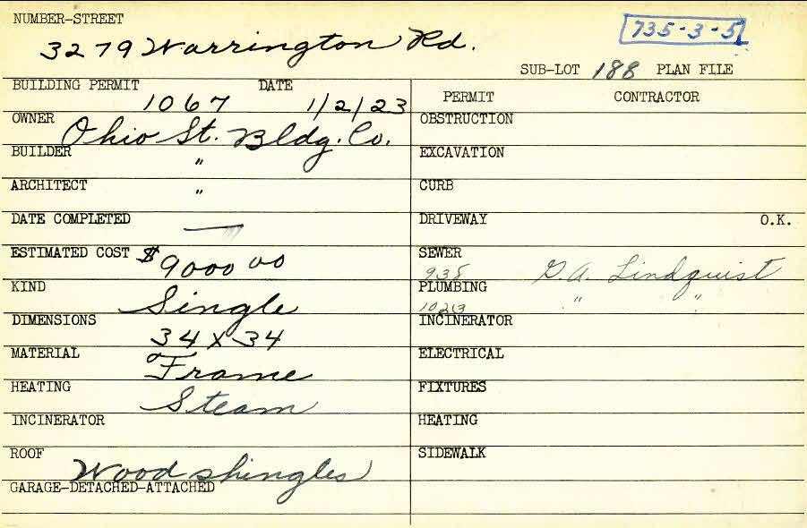 3279 Warrington Road Shaker Heights, OH 44120 PARCEL ID: 735-03-005 Building Permit Date: 01-02-1923 Plan File Number: 0 Neighborhood: Onaway Owner: Ohio State Building Company Builder: Ohio State Building Company Architect: Ohio State Building Company Estimated Cost: 9000 Kind: Single, Single Residence or Dwelling Material: Frame Heating: Steam Roof: Wood Shingle Card Available: yes |
