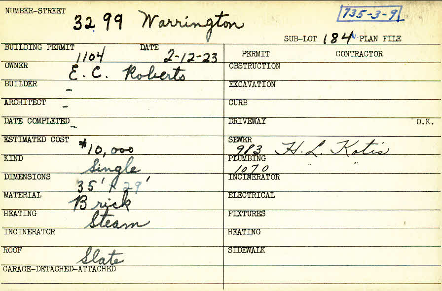 3299 Warrington Road Shaker Heights, OH 44120 PARCEL ID: 735-03-009 Building Permit Date: 02-12-1923 Plan File Number: 0 Neighborhood: Onaway Owner: Roberts, E. C. Estimated Cost: 10000 Kind: Single, Single Residence or Dwelling Material: Brick Heating: Steam Roof: Slate Card Available: yes |