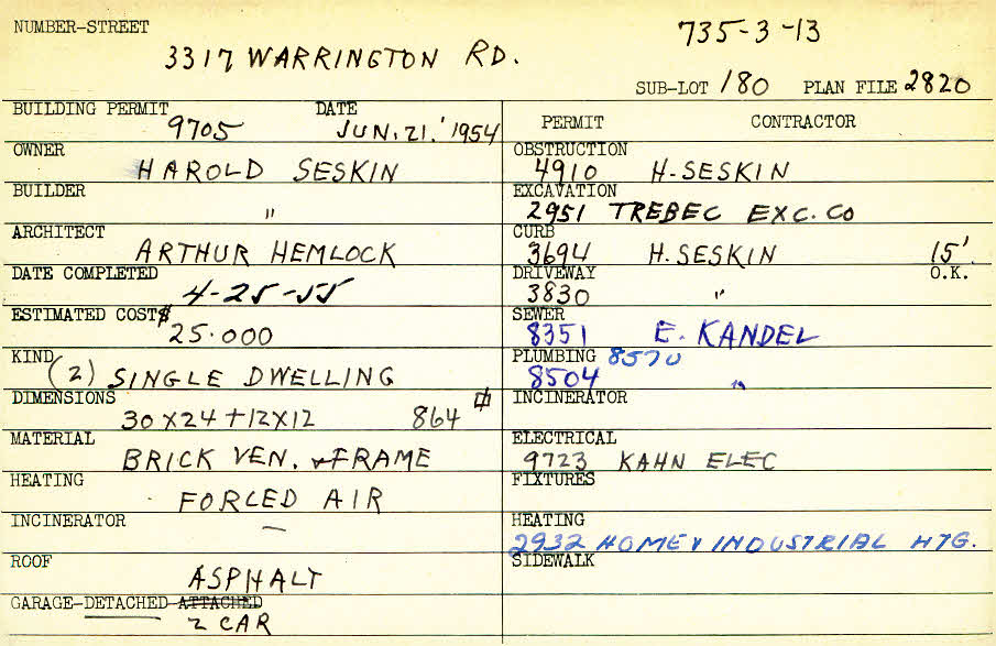3317 Warrington Road Shaker Heights, OH 44120 PARCEL ID: 735-03-013 Building Permit Date: 06-21-1954 Plan File Number: 2820 Neighborhood: Onaway Owner: Seskin, Harold Builder: Seskin, Harold Architect: Hemlock, Arthur Estimated Cost: 25000 Date Completed: 04-25-1955 Kind: Single, Single Residence or Dwelling (2) Material: Brick Veneer and Frame Heating: Forced Air Roof: Asphalt Garage: detached 2 car Card Available: yes |