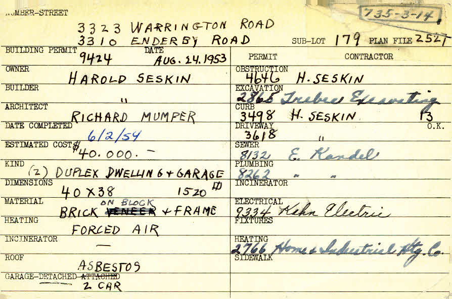 3323 Warrington Road Shaker Heights, OH 44120 PARCEL ID: 735-03-014 Building Permit Date: 08-24-1953 Plan File Number: 2527 Microfilm Roll: Roll #36 Neighborhood: Onaway Owner: Seskin, Harold Builder: Seskin, Harold Architect: Mumper, Richard Estimated Cost: 40000 Date Completed: 06-02-1954 Kind: Duplex or Two-Family and Garage Material: Brick on Block and Frame Heating: Forced Air Roof: Asbestos Garage: detached 2 car |