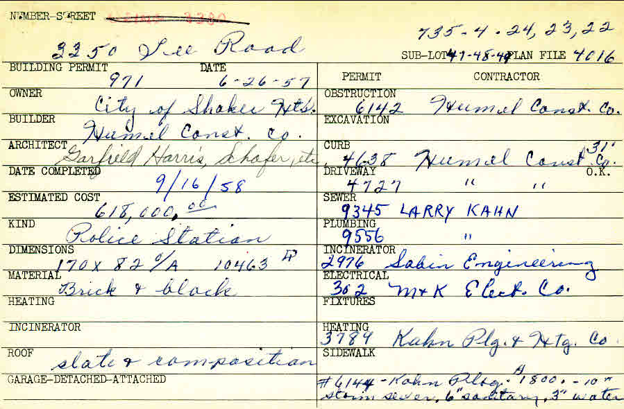 3350 Lee Road Shaker Heights, OH 44120 PARCEL ID: 735-04-024 Building Permit Date: 06-26-1957 Plan File Number: 4016 Owner: City of Shaker Heights Builder: Humel Construction Company Architect: Garfield, Harris, Robinson, and Schafer Estimated Cost: 618000 Date Completed: 09-16-1958 Kind: Government and Municipal (incl. Schools) Material: Brick and Block Roof: Slate Card Available: Yes |  |