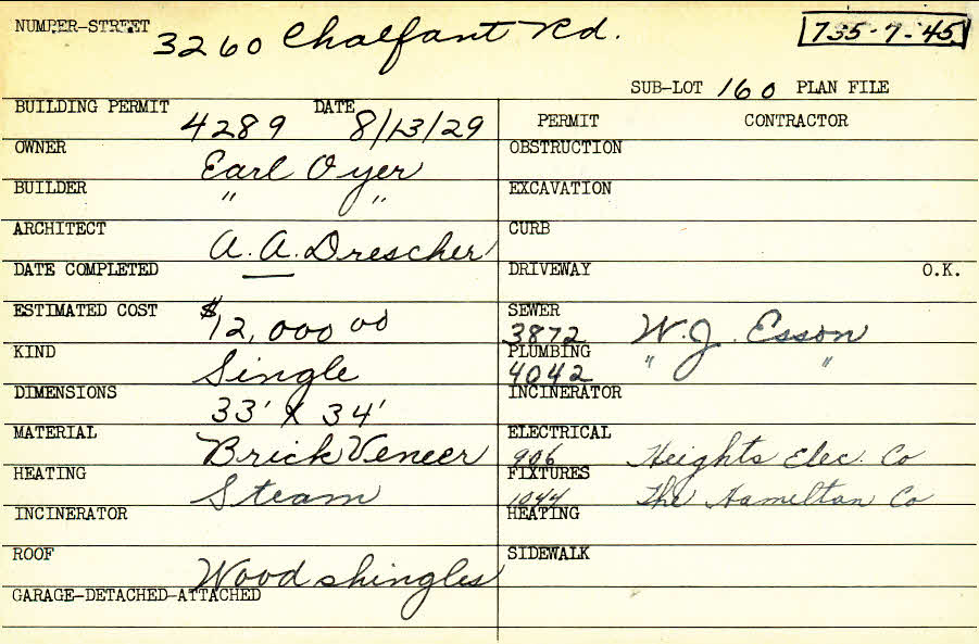 3260 Chalfant Road Shaker Heights, OH 44120 PARCEL ID: 735-07-045 Building Permit Date: 08-13-1929 Plan File Number: 0 Neighborhood: Fernway Owner: Oyer, Earl F. Builder: Oyer, Earl F. Architect: Drescher, A. A. Estimated Cost: 12000 Kind: Single, Single Residence or Dwelling Material: Brick Veneer Heating: Steam Roof: Wood Shingle |