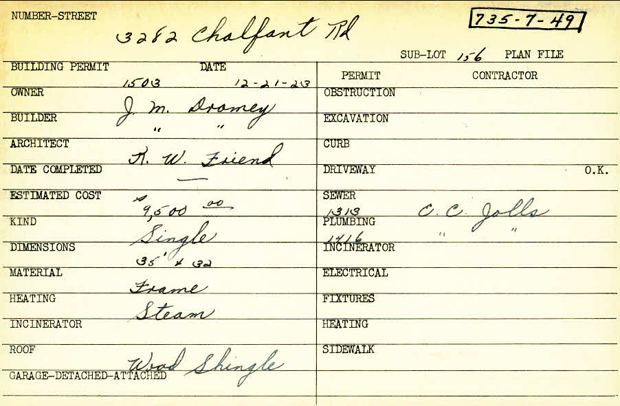 3282 Chalfant Road Shaker Heights, OH 44120 PARCEL ID: 735-07-049 Building Permit Date: 12-21-1923 Plan File Number: 0 Neighborhood: Fernway Owner: Dromey, J. M. Builder: Dromey, J. M. Architect: Friend, K. W. Estimated Cost: 9500 Kind: Single, Single Residence or Dwelling Material: Frame Heating: Steam Roof: Wood Shingle Card Available: yes |