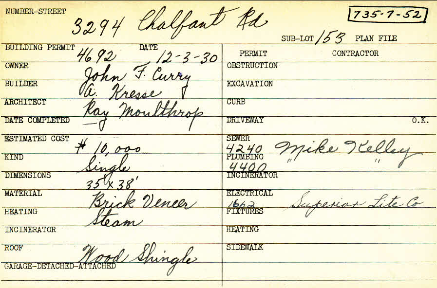 3294 Chalfant Road Shaker Heights, OH 44120 PARCEL ID: 735-07-052 Building Permit Date: 12-03-1930 Plan File Number: 0 Neighborhood: Fernway Owner: Curry, John F. Builder: Kresse, A. Architect: Moulthrop, Ray Estimated Cost: 10000 Kind: Single, Single Residence or Dwelling Material: Brick Veneer Heating: Steam Roof: Wood Shingle Card Available: yes |