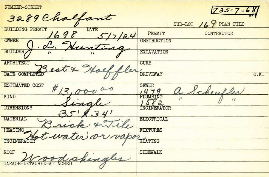 3289 Chalfant Road Shaker Heights, OH 44120 PARCEL ID: 735-07-068 Building Permit Date: 05-07-1924 Plan File Number: 0 Neighborhood: Fernway Owner: Hunting, J. L. Builder: Hunting, J. L. Architect: Best and Hoefler Estimated Cost: 13000 Kind: Single, Single Residence or Dwelling Material: Brick and tile Heating: Hot Water Roof: Wood Shingle |