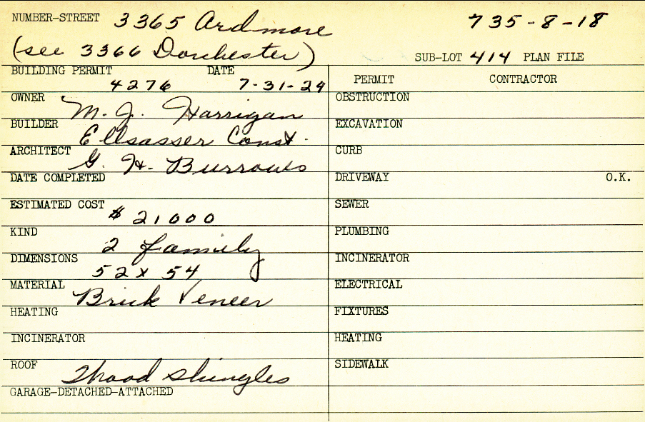 3365 Ardmore Road Shaker Heights, OH 44120 PARCEL ID: 735-08-088 Building Permit Date: 07-31-1924 Neighborhood: Fernway Owner: Harrigan, M. J. Builder: Ellsasser Construction Architect: Burrows, G. H. Estimated Cost: 21000 Kind: Duplex or Two-Family Material: Brick Veneer Roof: Wood Shingle Blueprints: no blueprints on microfilm |