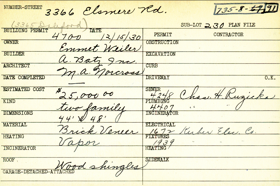 3366 Elsmere Road Shaker Heights, OH 44120 PARCEL ID: 735-08-091 Building Permit Date: 12-15-1930 Plan File Number: 0 Neighborhood: Fernway Owner: Weiler, Emmet Builder: A. Batz Inc. Architect: Norcross, M. A. Estimated Cost: 25000 Kind: Duplex or Two-Family Material: Brick veneer Heating: Vapor Roof: Wood Shingle |