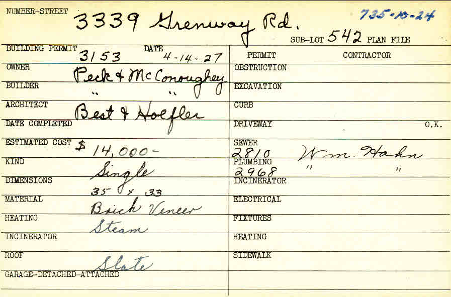 3339 Grenway Road Shaker Heights, OH 44122 PARCEL ID: 735-10-024 Building Permit Date: 04-14-1927 Plan File Number: 0 Neighborhood: Fernway Owner: Peck and McConoughey Builder: Peck and McConoughey Architect: Best and Hoefler Estimated Cost: 14000 Kind: Single, Single Residence or Dwelling Material: Brick Veneer Heating: Steam Roof: Slate Card Available: yes |