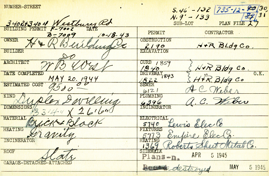 3402 Westbury Road Shaker Heights, OH 44120 PARCEL ID: 735-12-031 Building Permit Date: 10-18-1943 Plan File Number: 27, 2621 Microfilm Roll: Roll #36 Neighborhood: Moreland Owner: H and R Building Company Builder: H and R Building Company Architect: West, W. B. Estimated Cost: 9500 Date Completed: 05-20-1944 Kind: Duplex or Two-Family Material: Brick and Block Heating: Gravity System Roof: Slate |