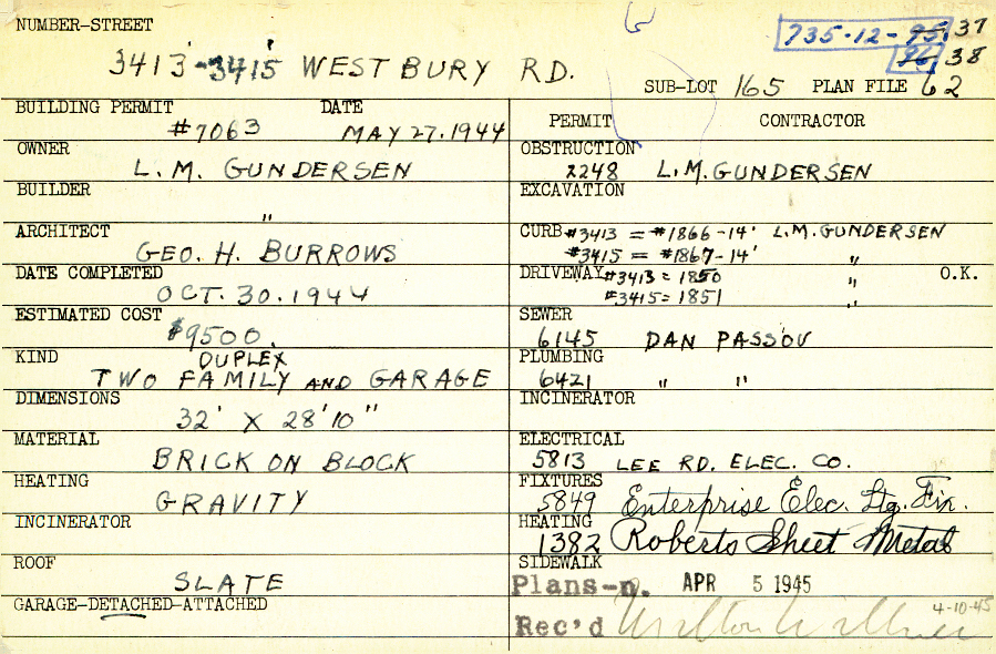 3413 Westbury Road Shaker Heights, OH 44120 PARCEL ID: 735-12-037 Building Permit Date: 05-27-1944 Plan File Number: 62, 9207 Microfilm Roll: Roll#102 Neighborhood: Moreland Owner: Gunderson, L. M. Builder: Gunderson, L. M. Architect: Burrows, George H. Estimated Cost: 9500 Date Completed: 10-30-1944 Kind: Duplex or Two-Family and Garage Material: Brick on Block Heating: Gravity System Roof: Slate Garage: detached |