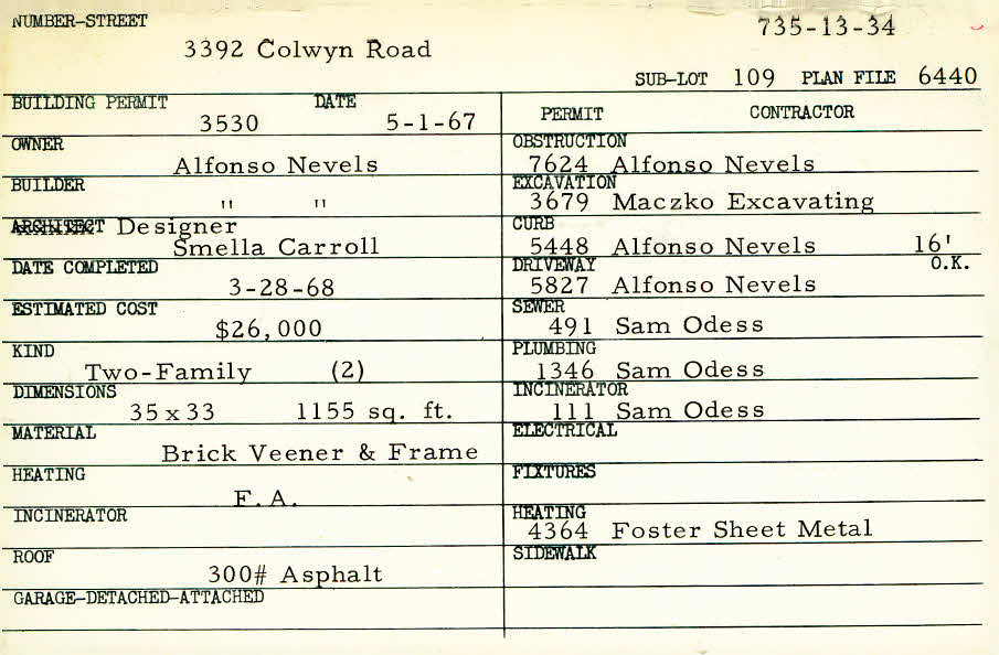 3392 Colwyn Road Shaker Heights, OH 44120 PARCEL ID: 735-13-034 Building Permit Date: 05-01-1967 Plan File Number: 6440 Microfilm Roll: Roll#85 Neighborhood: Moreland Owner: Nevels, Alfonso Builder: Nevels, Alfonso Architect: Carroll, Smella Estimated Cost: 26000 Date Completed: 03-28-1968 Kind: Duplex or Two-Family Material: Brick Veneer and Frame Heating: Forced Air Roof: 300# Min Asphalt |