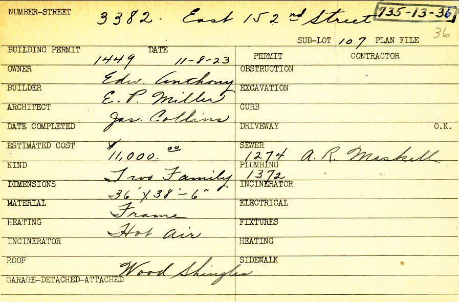 3382 Colwyn Road Shaker Heights, OH 44120 PARCEL ID: 735-13-036 Building Permit Date: 11-08-1923 Plan File Number: 0 Neighborhood: Moreland Owner: Anthony, Edward Builder: Miller, E. P. Architect: Collins, James Estimated Cost: 11000 Kind: Duplex or Two-Family Material: Frame Heating: Hot Air Roof: Wood Shingle Card Available: yes |