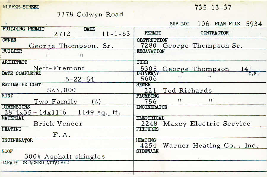 3378 Colwyn Road Shaker Heights, OH 44120 PARCEL ID: 735-13-037 Building Permit Date: 11-01-1963 Plan File Number: 5934, 5607, 5934, 9830 Microfilm Roll: Roll#76, Roll#80, Roll#104 Neighborhood: Moreland Owner: Thompson, George Sr. Builder: Thompson, George Sr. Architect: Neff-Fremont Estimated Cost: 23000 Date Completed: 05-22-1964 Kind: Duplex or Two-Family Material: Brick Veneer Heating: Forced Air Roof: 300# Min Asphalt |