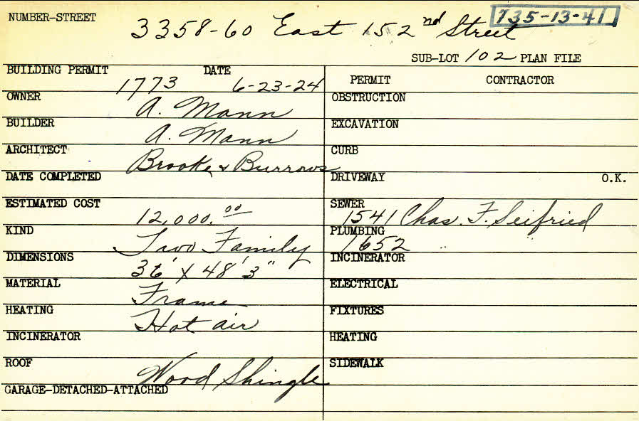 3358 Colwyn Road Shaker Heights, OH 44120 PARCEL ID: 735-13-041 Building Permit Date: 06-23-1924 Plan File Number: 0 Neighborhood: Moreland Owner: Mann, A. Builder: Mann, A. Architect: Brooke and Burrows Estimated Cost: 12000 Kind: Duplex or Two-Family Material: Frame Heating: Hot Air Roof: Wood Shingle |