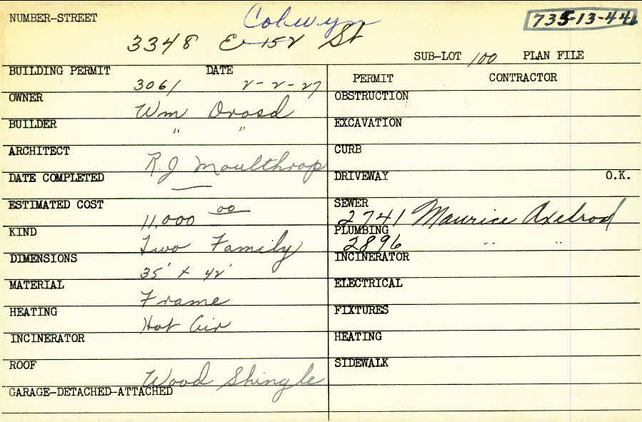 3348 Colwyn Road Shaker Heights, OH 44120 PARCEL ID: 735-13-044 Building Permit Date: 02-02-1927 Plan File Number: 6742, 6966 Microfilm Roll: Roll#88, Roll#90 Neighborhood: Moreland Owner: Orosd, William Builder: Orosd, William Architect: Moulthrop, R. J. Estimated Cost: 11000 Kind: Duplex or Two-Family Material: Frame Heating: Hot Air Roof: Wood Shingle |