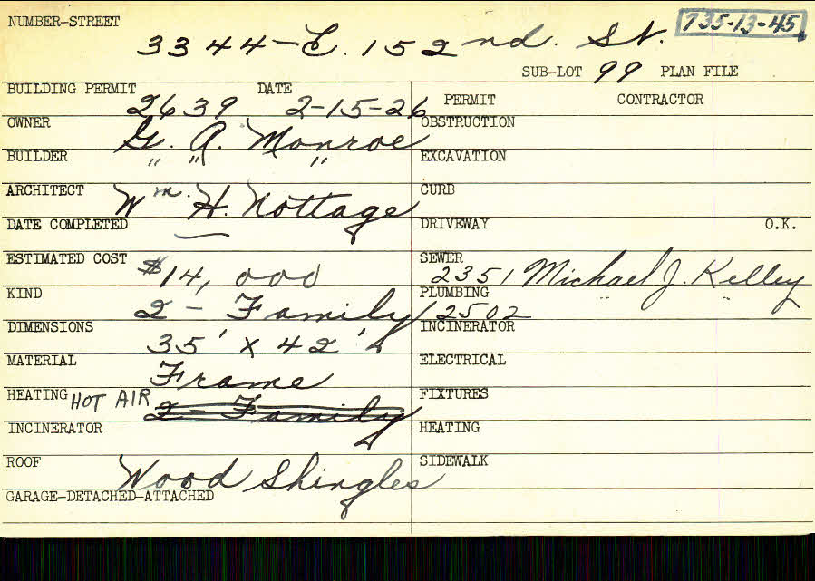 3344 Colwyn Road Shaker Heights, OH 44120 PARCEL ID: 735-13-045 Building Permit Date: 02-15-1926 Plan File Number: 0 Neighborhood: Moreland Owner: Monroe, G. A. Builder: Monroe, G. A. Architect: Nottage, William H. Estimated Cost: 14000 Kind: Duplex or Two-Family Material: Frame Heating: Hot Air Roof: Wood Shingle Card Available: yes |
