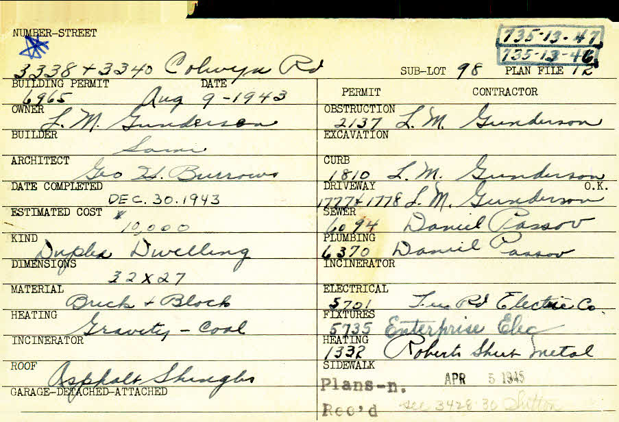 3338 Colwyn Road Shaker Heights, OH 44120 PARCEL ID: 735-13-047 Building Permit Date: 08-09-1943 Plan File Number: 12, 2924 scanned, 3249 Microfilm Roll: Roll041, Roll#47 Neighborhood: Moreland Owner: Gunderson, L. M. Builder: Gunderson, L. M. Architect: Burrows, George H. Estimated Cost: 10000 Date Completed: 12-30-1943 Kind: Duplex or Two-Family Material: Brick and Block Heating: Gravity System Roof: Asphalt Shingles |