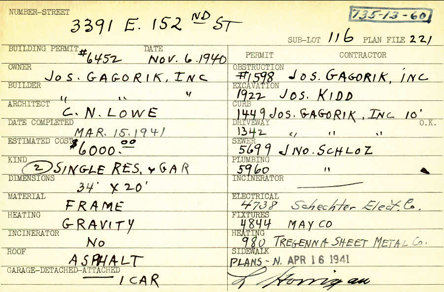 3391 Colwyn Road Shaker Heights, OH 44120 PARCEL ID: 735-13-060 Building Permit Date: 11-06-1940 Plan File Number: 221, 5402 Microfilm Roll: Roll#73 Neighborhood: Moreland Owner: Joseph Gagorik Inc. Builder: Joseph Gagorik Inc. Architect: Lowe, C. N. Estimated Cost: 6000 Date Completed: 03-15-1941 Kind: Single Dwelling and Garage (2) Material: Frame Heating: Gravity System Roof: Asphalt Garage: attached |