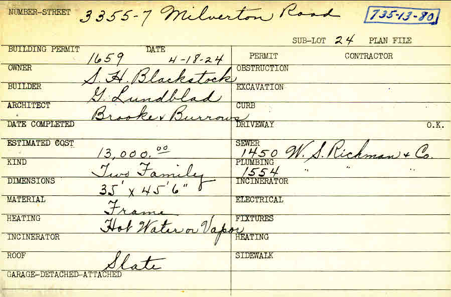 3355 Milverton Road Shaker Heights, OH 44120 PARCEL ID: 735-13-080 Building Permit Date: 04-18-1924 Plan File Number: 0 Neighborhood: Moreland Owner: Blackstock, S. H. Builder: Lundblad, G. Architect: Brooke and Burrows Estimated Cost: 13000 Kind: Duplex or Two-Family Material: Frame Heating: Hot Water Roof: Slate |