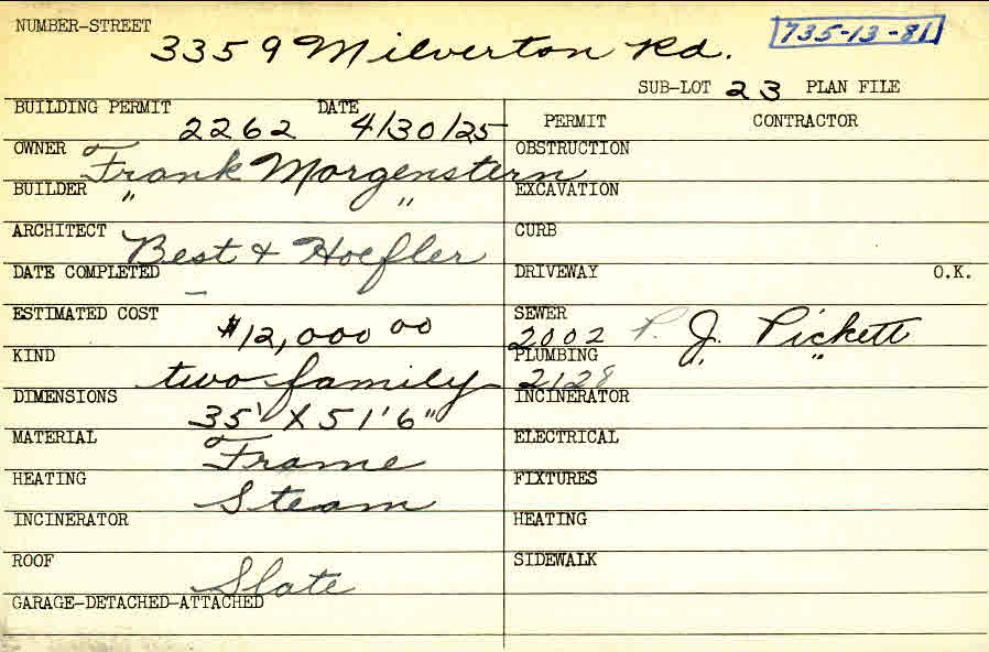 3359 Milverton Road Shaker Heights, OH 44120 PARCEL ID: 735-13-081 Building Permit Date: 04-30-1925 Plan File Number: 0 Neighborhood: Moreland Owner: Morgenstern, Frank Builder: Morgenstern, Frank Architect: Best and Hoefler Estimated Cost: 12000 Kind: Duplex or Two-Family Material: Frame Heating: Steam Roof: Slate |