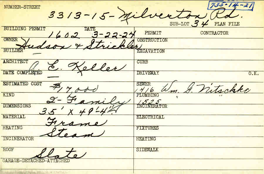 3315 Milverton Road Shaker Heights, OH 44120 PARCEL ID: 735-14-021 Building Permit Date: 03-22-1924 Plan File Number: 0 Neighborhood: Moreland Owner: Hudson and Strickler Builder: Hudson and Strickler Architect: Keller, Arthur Emil Estimated Cost: 17000 Kind: Duplex or Two-Family Material: Frame Heating: Steam Roof: Slate |