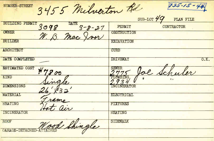 3455 Milverton Road Shaker Heights, OH 44120 PARCEL ID: 735-15-044 Building Permit Date: 03-08-1927 Plan File Number: 0 Neighborhood: Moreland Owner: MacIvor W. D. Estimated Cost: 7800 Kind: Single, Single Residence or Dwelling Material: Frame Heating: Hot Air Roof: Wood Shingle |