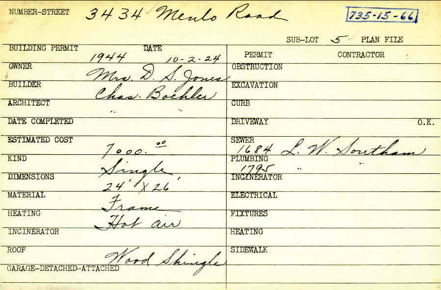 3434 Menlo Road Shaker Heights, OH 44120 PARCEL ID: 735-15-066 Building Permit Date: 10-02-1924 Plan File Number: 0 Neighborhood: Moreland Owner: Jones, Mrs. D. S. Builder: Boehler, Charles Architect: Boehler, Charles Estimated Cost: 7000 Kind: Single, Single Residence or Dwelling Material: Frame Heating: Hot Air Roof: Wood Shingle Card Available: yes |