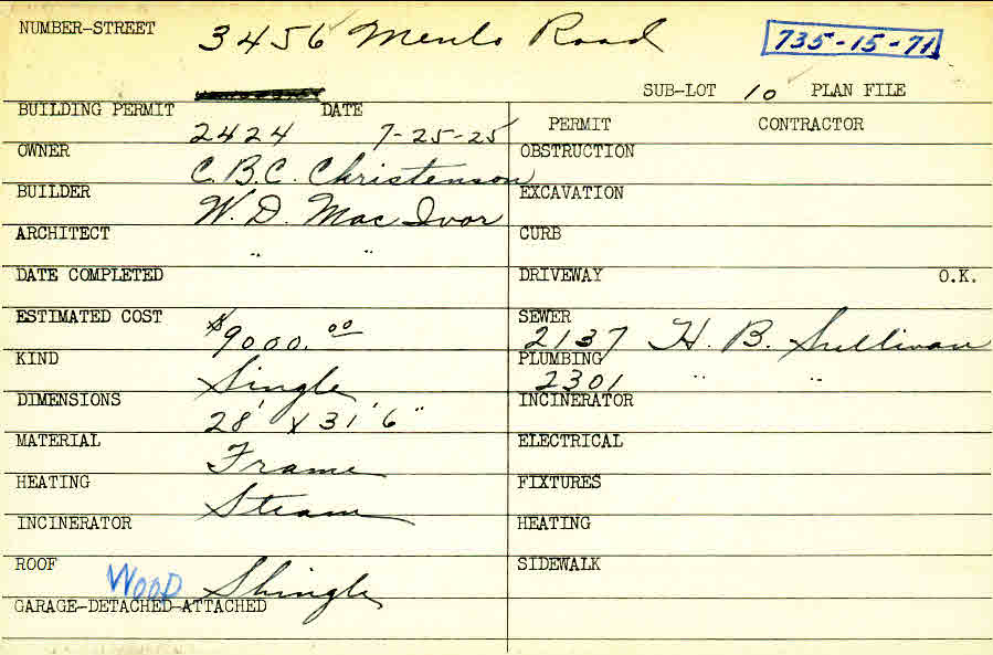 3456 Menlo Road Shaker Heights, OH 44120 PARCEL ID: 735-15-071 Building Permit Date: 07-25-1925 Plan File Number: 0 Neighborhood: Moreland Owner: Christenson, C. B. C. Builder: MacIvor, W. D. Architect: MacIvor, W. D. Estimated Cost: 9000 Kind: Single, Single Residence or Dwelling Material: Frame Heating: Steam Roof: Wood Shingle Card Available: yes |