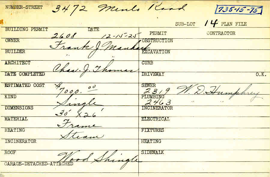 3472 Menlo Road Shaker Heights, OH 44120 PARCEL ID: 735-15-075 Building Permit Date: 12-15-1925 Plan File Number: 12149 Microfilm Roll: NewRoll#11 Neighborhood: Moreland Owner: Manhart, Frank J. Builder: Manhart, Frank J. Architect: Thomas, Charles J. Estimated Cost: 7000 Kind: Single, Single Residence or Dwelling Material: Frame Heating: Steam Roof: Wood Shingle |