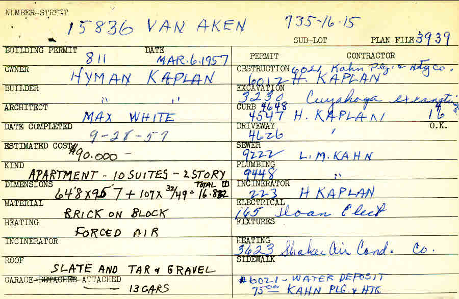 15836 Van Aken Boulevard Shaker Heights, OH 44120 PARCEL ID: 735-16-015 Building Permit Date: 03-05-1957 Plan File Number: 3939, 91-138 Microfilm Roll: Roll#58, NewRoll#1 Neighborhood: Moreland Owner: Kaplan, Hyman Builder: Kaplan, Hyman Architect: White, Max H. Estimated Cost: 90000 Date Completed: 09-27-1957 Kind: Apartment or Multi-family (3+) Material: Brick on Block Heating: Forced Air Roof: Slate, tar & gravel Garage: attached |