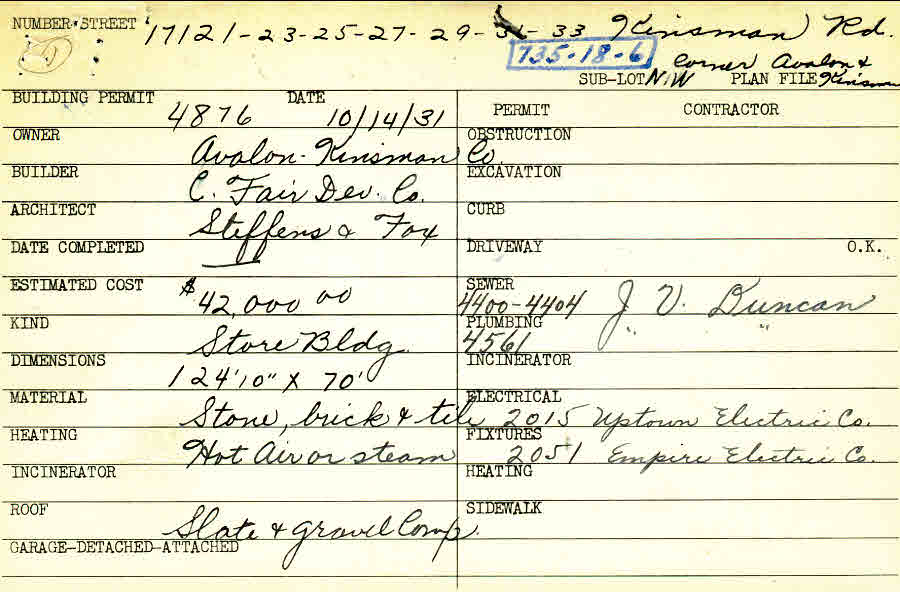 17121 Chagrin Boulevard Shaker Heights, OH 44120 PARCEL ID: 735-18-006 Building Permit Date: 10-14-1931 Plan File Number: 938 scanned, 2497 scanned, 4319 scanned, 4334 scanned, 5055, 5387, 9788 Microfilm Roll: Roll012, Roll035, Roll062, Roll#69, Roll#73, Roll#104 Neighborhood: Lomond Owner: Avalon - Kinsman Company Builder: C. Fair Development Company Architect: Steffens and Fox Estimated Cost: 42000 Kind: Commercial - Retail or Office Material: Stone, Brick and Tile Heating: Hot Air Roof: Slate Card Available: Yes |