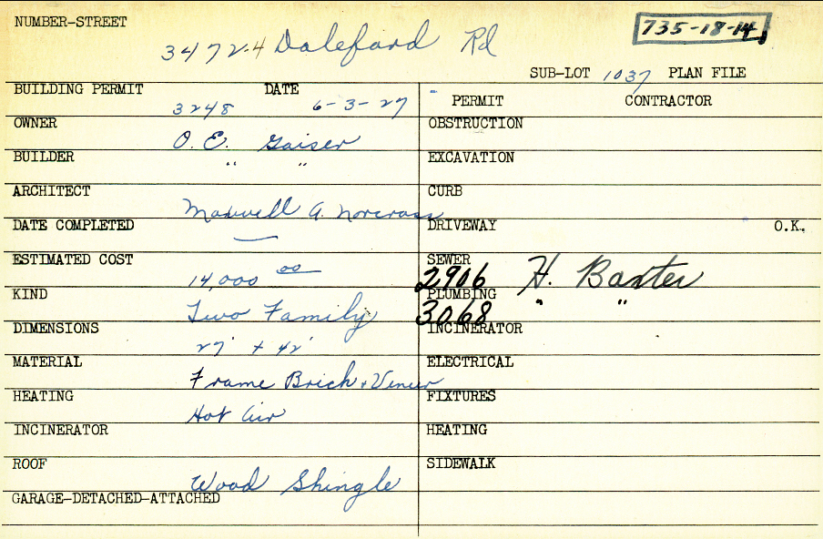 3474 Daleford Road Shaker Heights, OH 44120 PARCEL ID: 735-18-014 Building Permit Date: 06-03-1927 Plan File Number: 0 Neighborhood: Lomond Owner: Gaiser, O. E. Builder: Gaiser, O. E. Architect: Norcross, Maxwell A. Estimated Cost: 14000 Kind: Duplex or Two-Family Material: Frame brick and veneer Heating: Hot Air Roof: Wood Shingle |