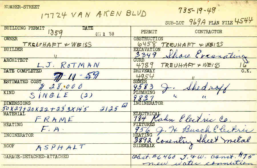 17724 Van Aken Boulevard Shaker Heights, OH 44120 PARCEL ID: 735-19-048 Building Permit Date: 10-01-1958 Plan File Number: 4544, 6022 Microfilm Roll: Roll#63, Roll#80 Neighborhood: Lomond Owner: Treuhaft and Weiss Builder: Treuhaft and Weiss Architect: Rotman, L. J. Estimated Cost: 28000 Date Completed: 07-11-1959 Kind: Single, Single Residence or Dwelling (2) Material: Frame Heating: Forced Air Roof: Asphalt |