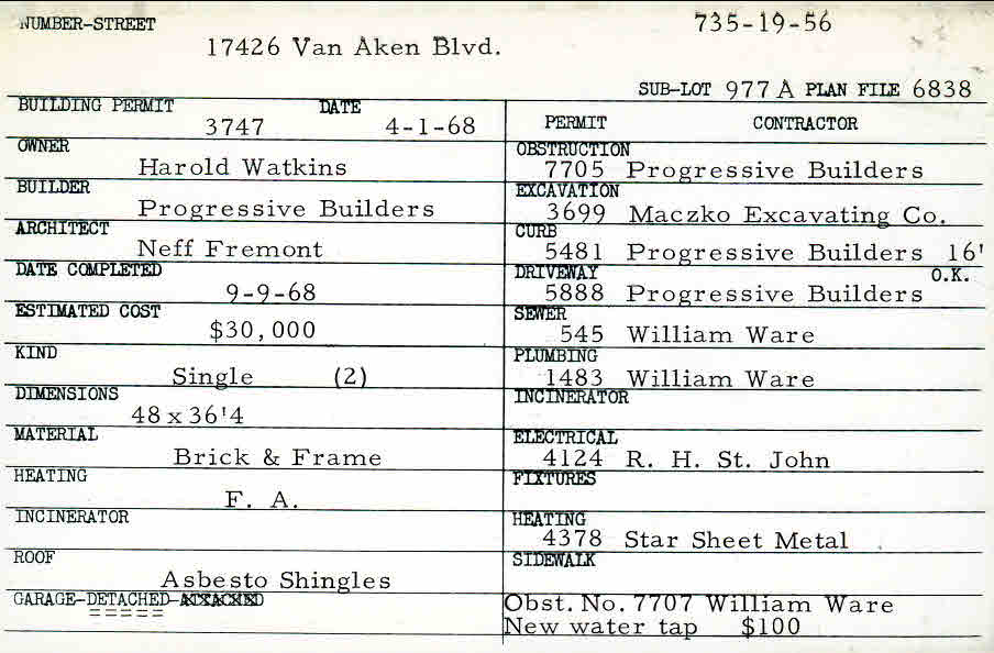 17426 Van Aken Boulevard Shaker Heights, OH 44120 PARCEL ID: 735-19-056 Building Permit Date: 04-01-1968 Plan File Number: 6838, 7807 Microfilm Roll: Roll#88, Roll#94 Neighborhood: Lomond Owner: Watkins, Harold Builder: Progressive Builders Architect: Neff Fremont Estimated Cost: 30000 Date Completed: 09-09-1968 Kind: Single, Single Residence or Dwelling (2) Material: Brick and Frame Heating: Forced Air Roof: Asbestos Shingles Garage: detached |