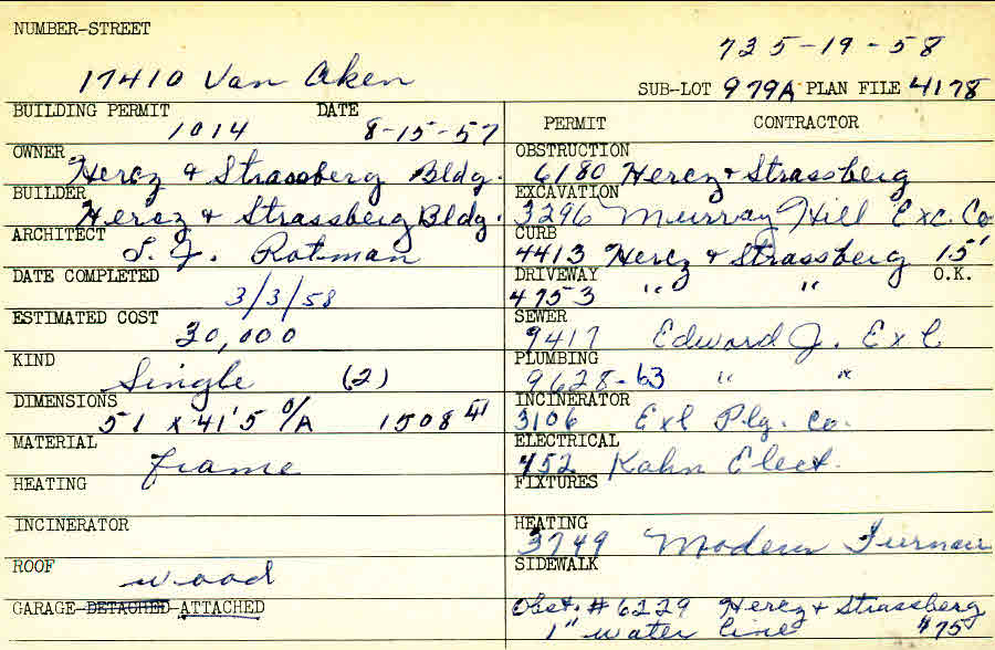 17410 Van Aken Boulevard Shaker Heights, OH 44120 PARCEL ID: 735-19-058 Building Permit Date: 08-14-1957 Plan File Number: 4178 Microfilm Roll: Roll#61 Neighborhood: Lomond Owner: Herez and Strassberg Building Builder: Herez and Strassberg Building Architect: Ratman, L. J. Estimated Cost: 30000 Date Completed: 03-02-1958 Kind: Single, Single Residence or Dwelling (2) Material: Frame Roof: Wood Garage: attached |