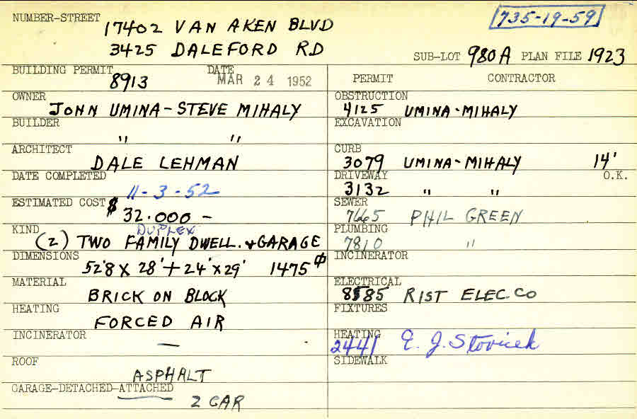 17402 Van Aken Boulevard Shaker Heights, OH 44120 PARCEL ID: 735-19-059 Building Permit Date: 03-23-1952 Plan File Number: 1923 all scanned Microfilm Roll: Roll029 Neighborhood: Lomond Owner: John Umina - Steve Hihaly Builder: John Umina - Steve Hihaly Architect: Lehman, Dale Estimated Cost: 32000 Date Completed: 11-02-1952 Kind: Duplex or Two-Family and Garage Material: Brick on Block Heating: Forced Air Roof: Asphalt Garage: attached 2 car |