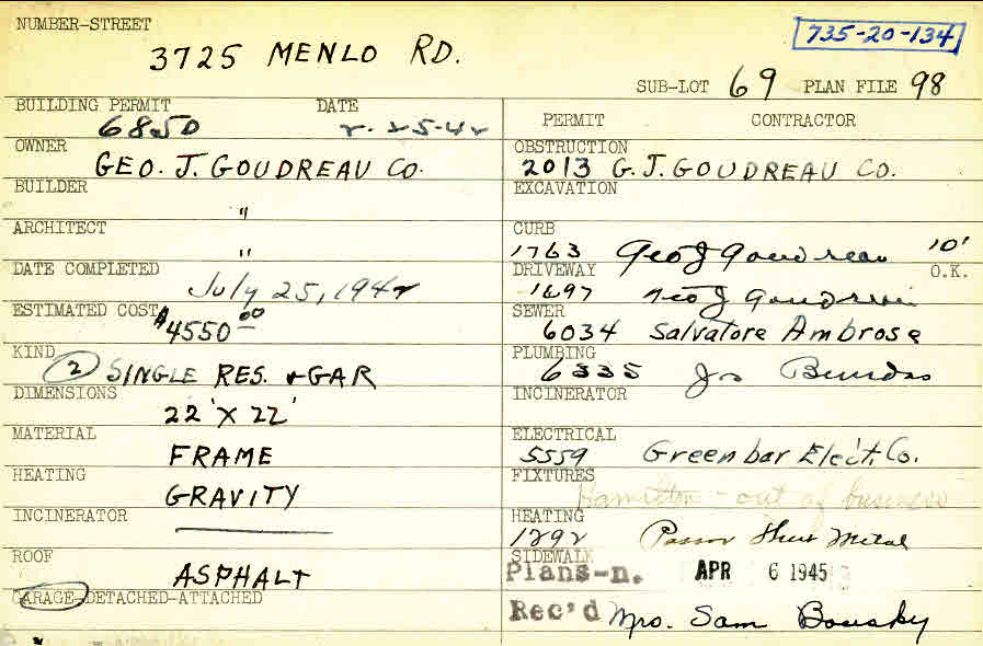 3725 Menlo Road Shaker Heights, OH 44120 PARCEL ID: 735-20-134 Building Permit Date: 02-25-1942 Plan File Number: 98, 10271 Microfilm Roll: NewRoll#3 Neighborhood: Moreland Owner: George J. Goudreau Company Builder: George J. Goudreau Company Architect: George J. Goudreau Company Estimated Cost: 4550 Date Completed: 07-25-1942 Kind: Single Dwelling and Garage (2) Material: Frame Heating: Gravity System Roof: Asphalt |
