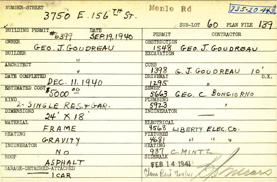 3750 Menlo Road Shaker Heights, OH 44120 PARCEL ID: 735-20-143 Building Permit Date: 09-19-1940 Plan File Number: 139, 6333 Microfilm Roll: Roll#85 Neighborhood: Moreland Owner: Goudreau, George J. Builder: Goudreau, George J. Architect: Goudreau, George J. Estimated Cost: 5000 Date Completed: 12-11-1940 Kind: Single Dwelling and Garage (2) Material: Frame Heating: Gravity System Roof: Asphalt Garage: detached |