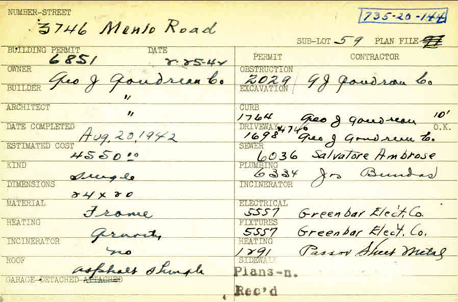 3746 Menlo Road Shaker Heights, OH 44120 PARCEL ID: 735-20-144 Building Permit Date: 02-25-1942 Plan File Number: 185 all scanned Microfilm Roll: Roll002 Neighborhood: Moreland Owner: George J. Goudreau Company Builder: George J. Goudreau Company Architect: George J. Goudreau Company Estimated Cost: 4550 Date Completed: 09-20-1942 Kind: Single, Single Residence or Dwelling Material: Frame Heating: Gravity System Roof: Asphalt Shingles Garage: detached |