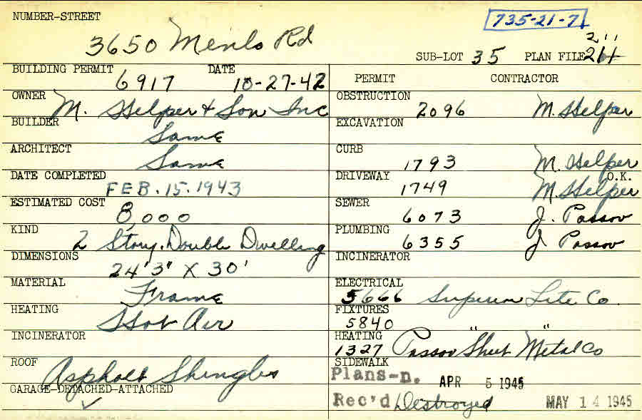 3650 Menlo Road Shaker Heights, OH 44120 PARCEL ID: 735-21-007 Building Permit Date: 10-27-1942 Plan File Number: 2492 all scanned Microfilm Roll: Roll035 Neighborhood: Moreland Owner: M. Helper and Son Inc. Builder: M. Helper and Son Inc. Architect: M. Helper and Son Inc. Estimated Cost: 8000 Date Completed: 02-15-1943 Kind: Duplex or Two-Family Material: Frame Heating: Hot Air Roof: Asphalt Shingles Garage: detached |