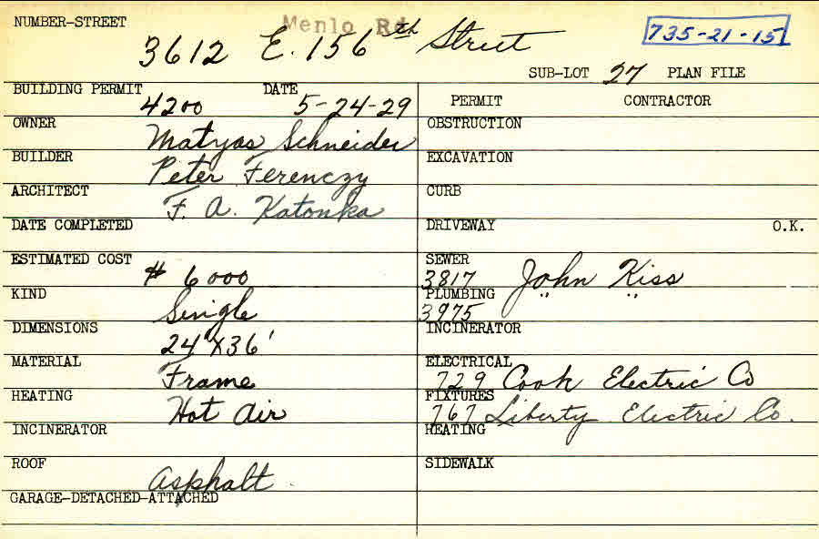 3612 Menlo Road Shaker Heights, OH 44120 PARCEL ID: 735-21-015 Building Permit Date: 05-24-1929 Plan File Number: 0 Neighborhood: Moreland Owner: Schneider, Matyas Builder: Ferenczy, Peter Architect: Katonka, F. A. Estimated Cost: 6000 Kind: Single, Single Residence or Dwelling Material: Frame Heating: Hot Air Roof: Asphalt |