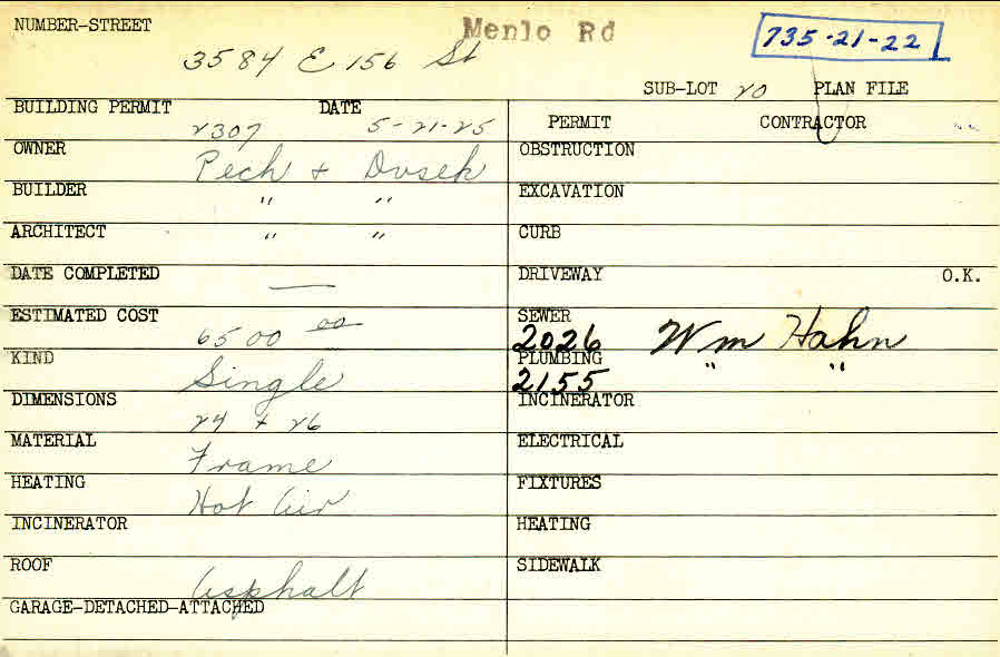 3584 Menlo Road Shaker Heights, OH 44120 PARCEL ID: 735-21-022 Building Permit Date: 05-21-1925 Plan File Number: 0 Neighborhood: Moreland Owner: Pech and Dvsek Builder: Pech and Dvsek Architect: Pech and Dvsek Estimated Cost: 6500 Kind: Single, Single Residence or Dwelling Material: Frame Heating: Hot Air Roof: Asphalt Card Available: yes |