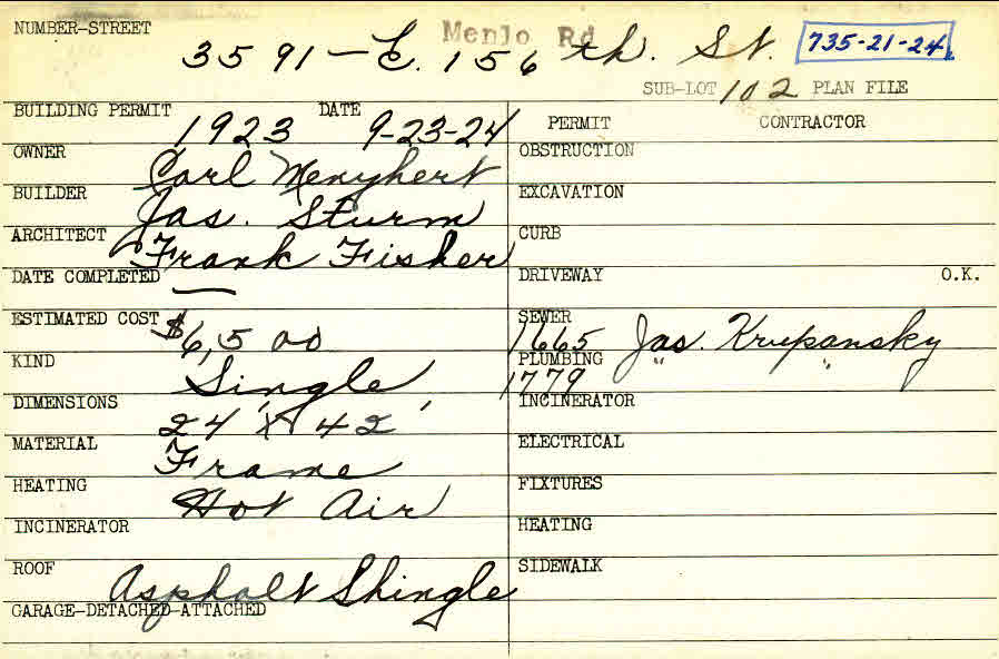 3591 Menlo Road Shaker Heights, OH 44120 PARCEL ID: 735-21-024 Building Permit Date: 09-23-1924 Plan File Number: 0 Neighborhood: Moreland Owner: Menyhert, Carl Builder: Sturm, James Architect: Fisher, Frank Estimated Cost: 6500 Kind: Single, Single Residence or Dwelling Material: Frame Heating: Hot Air Roof: Asphalt Shingles Card Available: yes |