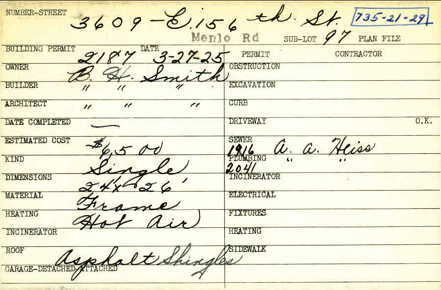 3609 Menlo Road Shaker Heights, OH 44120 PARCEL ID: 735-21-029 Building Permit Date: 03-27-1925 Plan File Number: 0 Neighborhood: Moreland Owner: Smith, B.H. Builder: Smith, B. H. Architect: Smith, B. H. Estimated Cost: 6500 Kind: Single, Single Residence or Dwelling Material: Frame Heating: Hot Air Roof: Asphalt Shingles |
