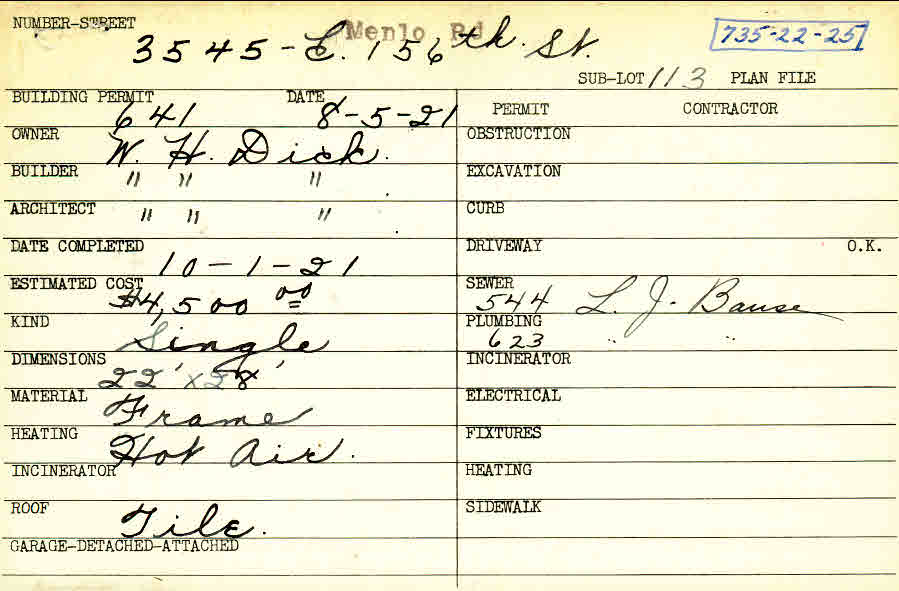 3545 Menlo Road Shaker Heights, OH 44120 PARCEL ID: 735-22-025 Building Permit Date: 08-05-1921 Plan File Number: 7607 Microfilm Roll: Roll#93 Neighborhood: Moreland Owner: Dick, W. H. Builder: Dick, W. H. Architect: Dick, W. H. Estimated Cost: 4500 Date Completed: 10-01-1921 Kind: Single, Single Residence or Dwelling Material: Frame Heating: Hot Air Roof: Tile |