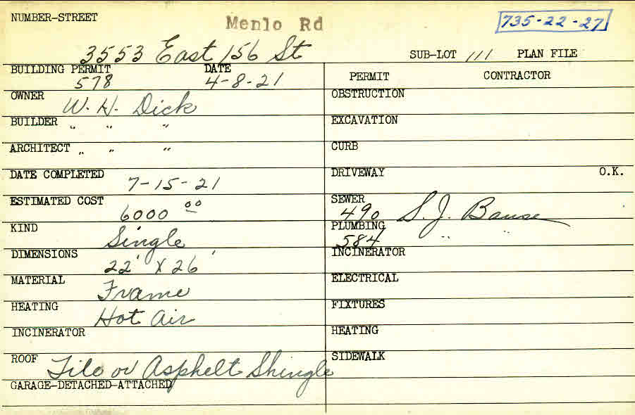 3553 Menlo Road Shaker Heights, OH 44120 PARCEL ID: 735-22-027 Building Permit Date: 04-08-1921 Plan File Number: 0 Neighborhood: Moreland Owner: Dick, W. H. Builder: Dick, W. H. Architect: Dick, W. H. Estimated Cost: 6000 Date Completed: 07-15-1921 Kind: Single, Single Residence or Dwelling Material: Frame Heating: Hot Air Roof: Tile Card Available: yes |