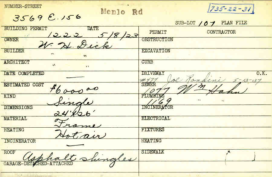 3569 Menlo Road Shaker Heights, OH 44120 PARCEL ID: 735-22-031 Building Permit Date: 05-08-1923 Plan File Number: 0 Neighborhood: Moreland Owner: Dick, W. H. Builder: Dick, W. H. Architect: Dick, W. H. Estimated Cost: 6000 Kind: Single, Single Residence or Dwelling Material: Frame Heating: Hot Air Roof: Asphalt Shingles Card Available: yes |